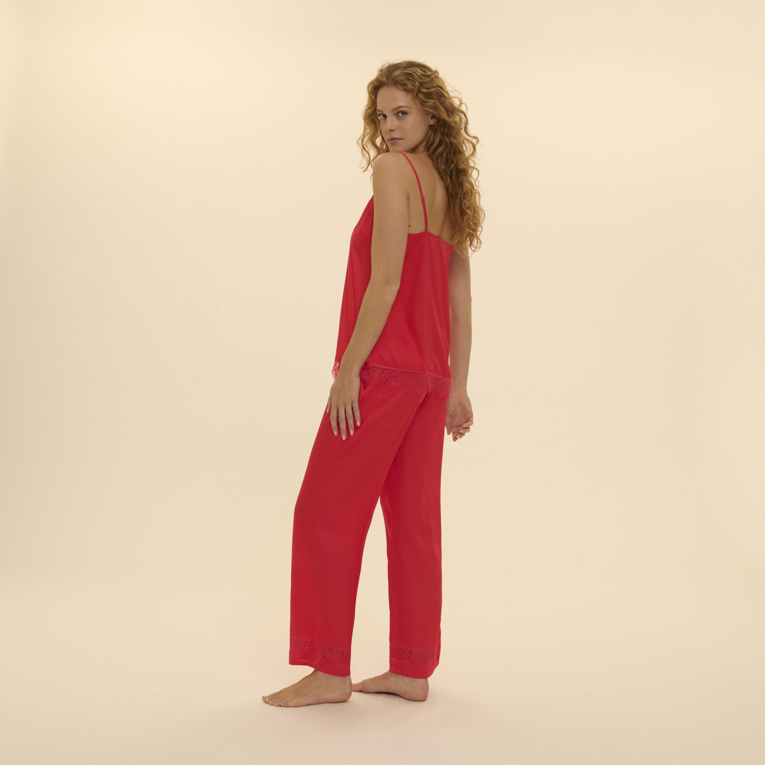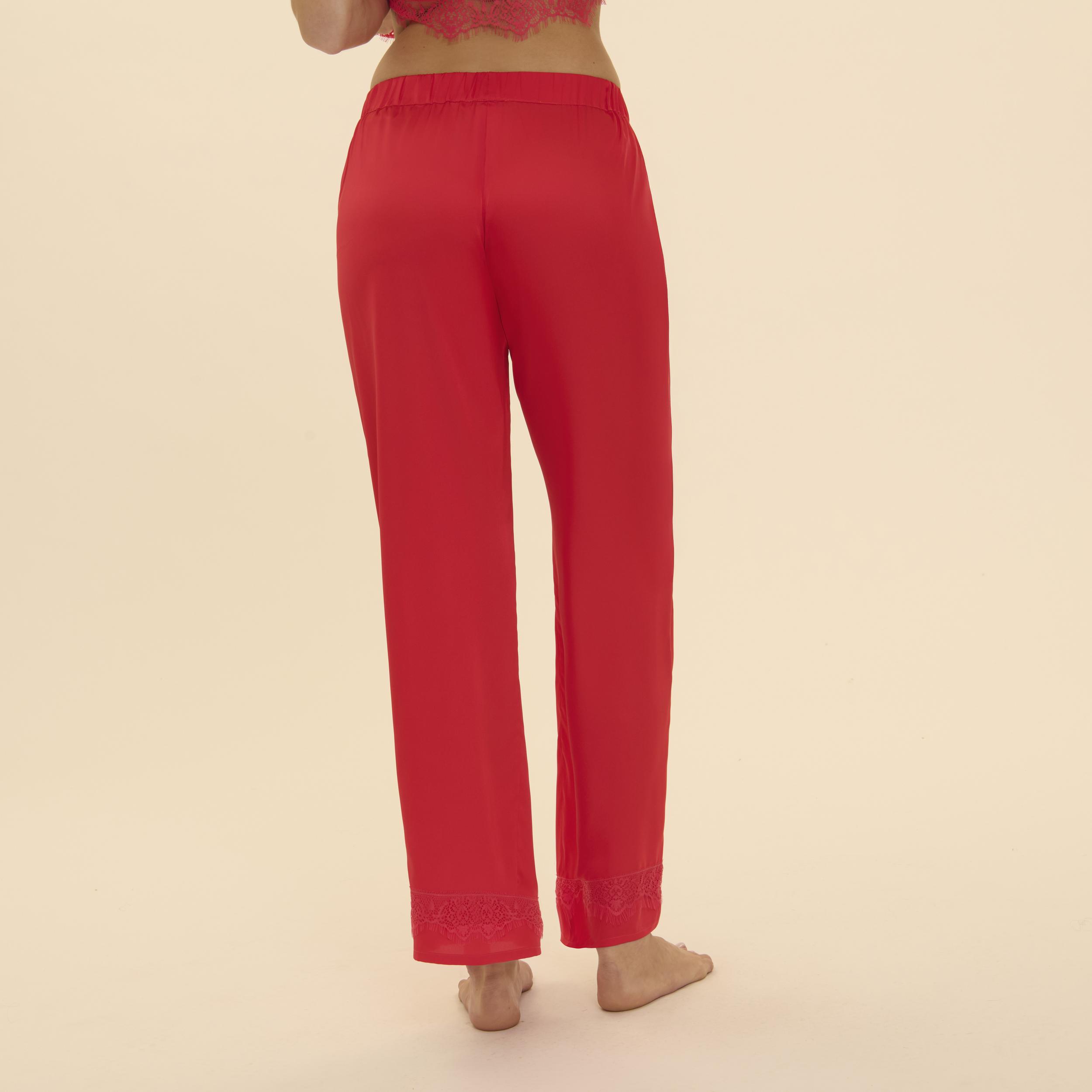 Noční kalhoty ze saténu. V pase mají gumu pro pohodlné nošení. Rovný střih. Široké a elastické s gumou v pase. Konce nohavic lemované pruhem krajky.