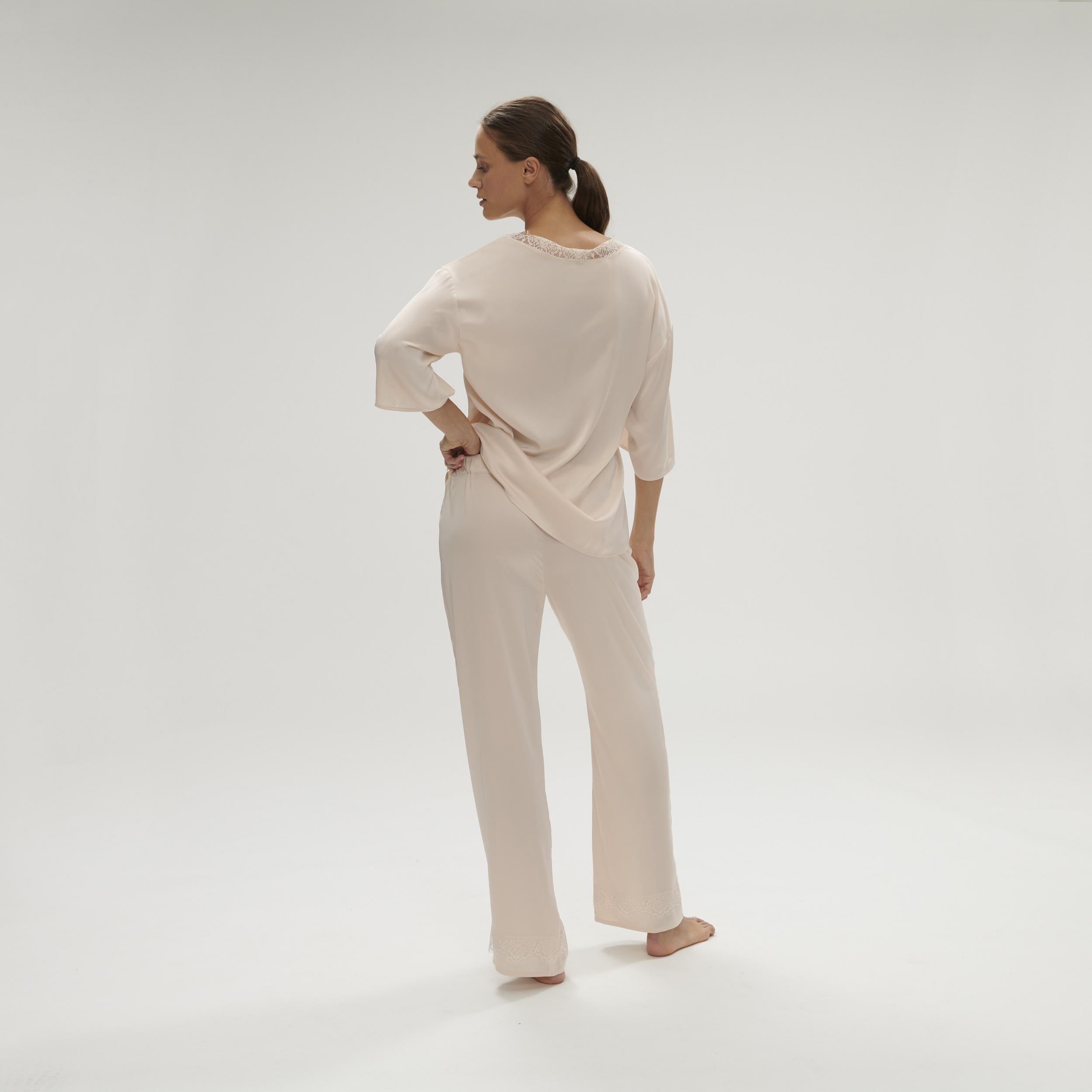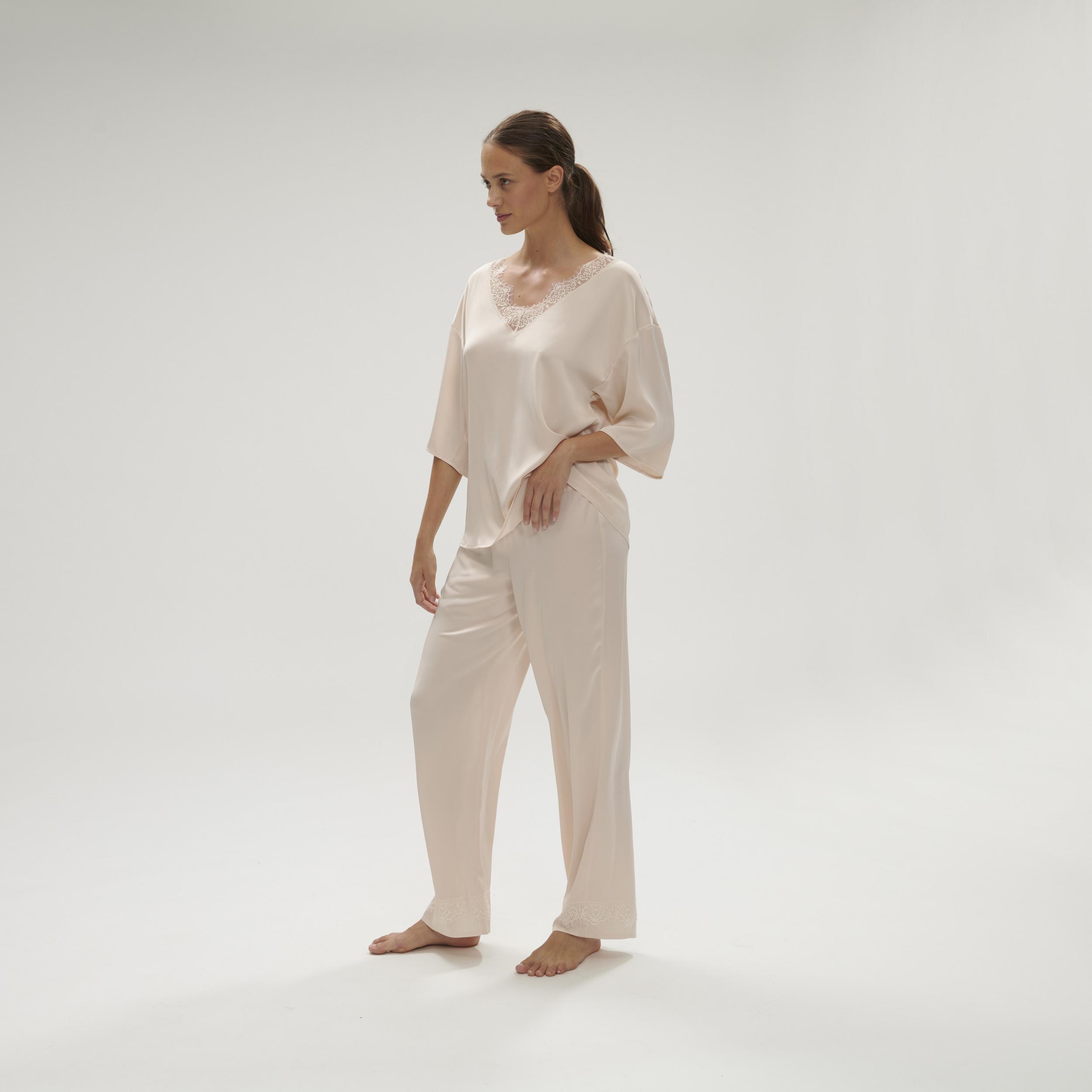 Noční kalhoty ze saténu. V pase mají gumu pro pohodlné nošení. Rovný střih. Široké a elastické s gumou v pase. Konce nohavic lemované pruhem krajky.