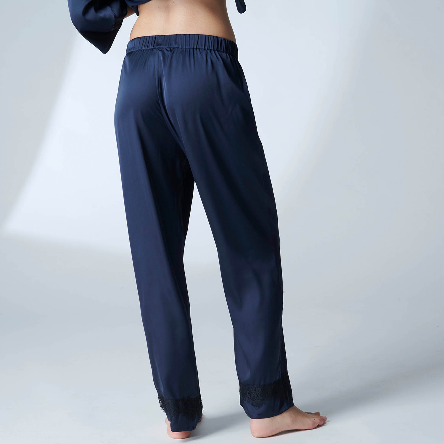 Noční kalhoty ze saténu. V pase mají gumu pro pohodlné nošení. Rovný střih. Široké a elastické s gumou v pase. Konce nohavic lemované pruhem krajky.